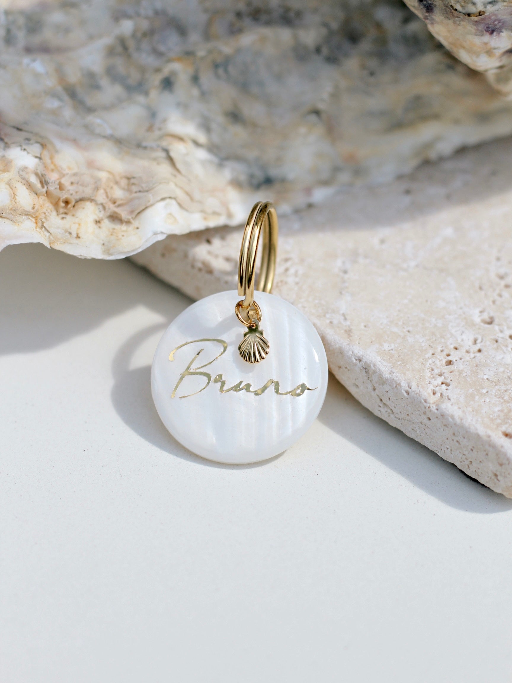 Für den Notfall lässt sich außerdem eine Handynummer auf die Rückseite schreiben. Diese Marke hat einen Durchmesser von 3cm und besteht aus echtem Perlmutt.
